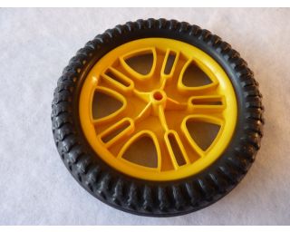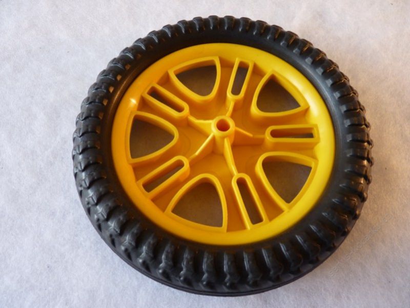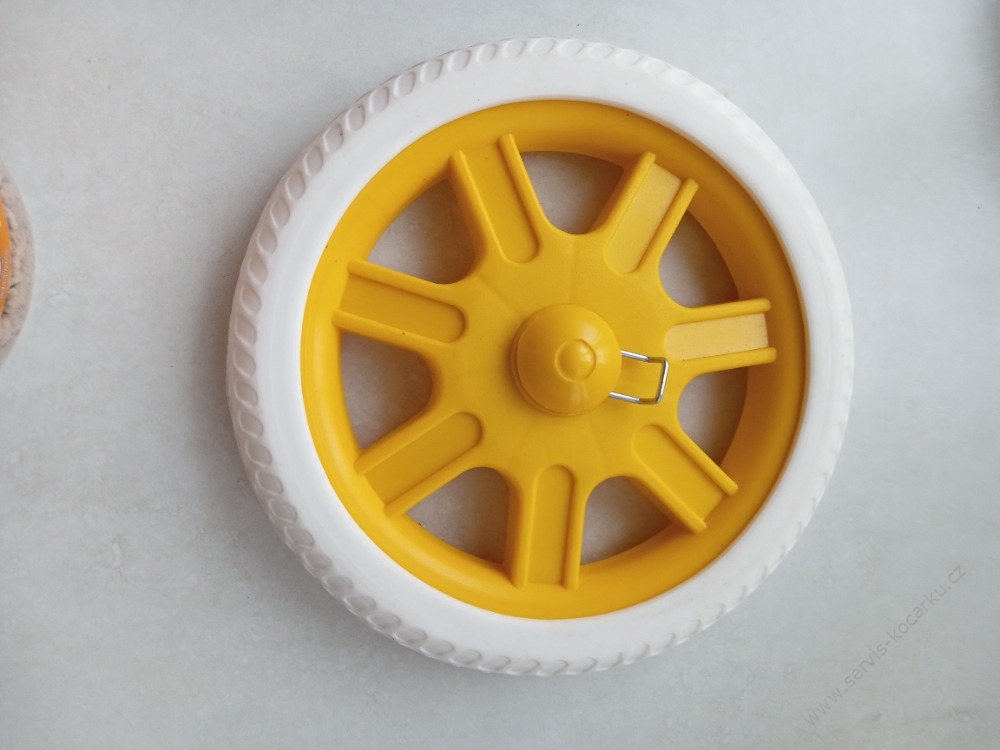 Kolečko ke kočárku pro panenky v barvě žluté. Materiál plast, pneu pěna. Určeno pro osičku ø 8 mm. Celkový průměr kolečka je cca 185 mm. Cena za 1 kus.